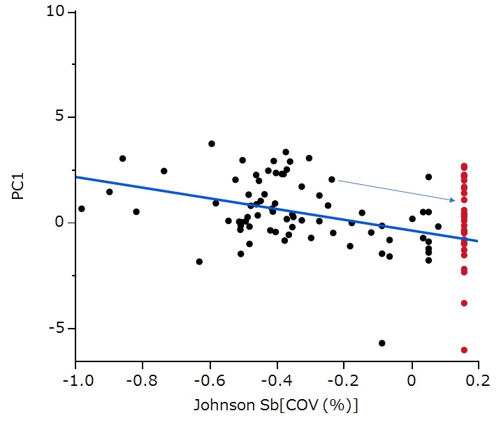 Johnson Sb[COV] = ln[ (COV − 4.9)/(100.063 − COV) ] × 0.111 − 0.655