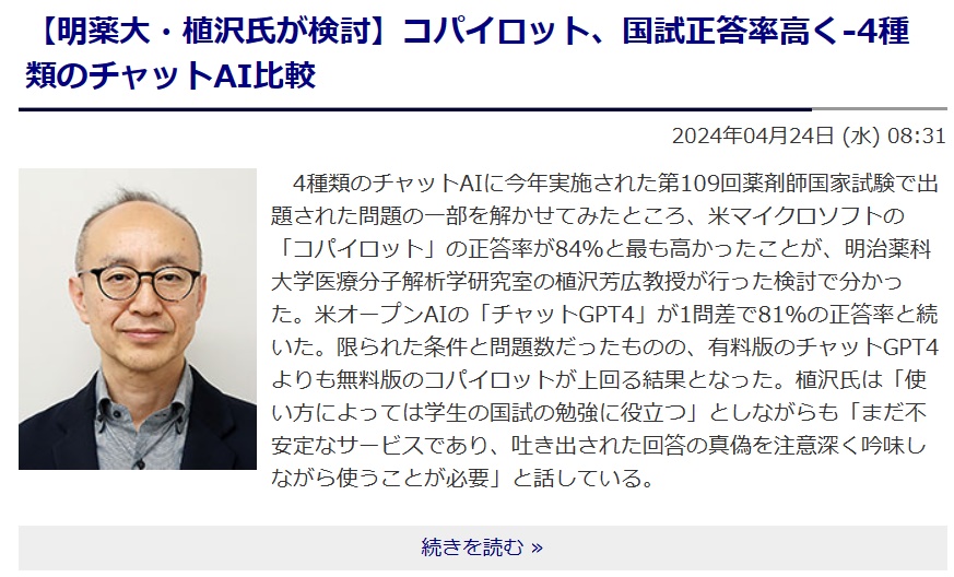 Chat AIは薬剤師国家試験の問題を解けるのか?(薬事日報に掲載されました) 2024年4月24日 最終更新日時 : 2026年1月7日 kanri 本研究ブログの記事「Chat AIは薬剤師国家試験の問題を解けるのか?」に関する記事が薬事日報に掲載されました(記事の全文はこちら)。